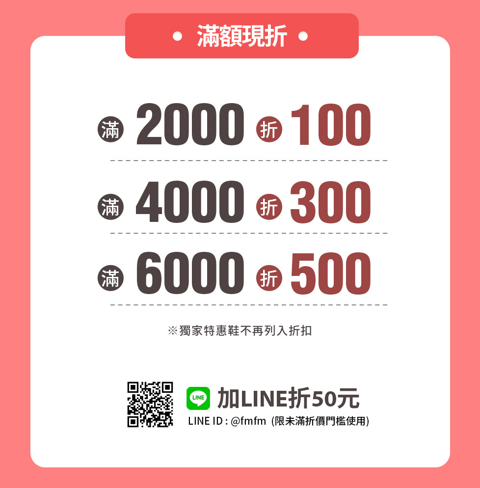 滿2000元現折100元。 滿4000元現折300元。消費滿6000元現折500元。(獨家特惠鞋不列入折扣)。加LINE折50元(限未滿折價門檻使用)。
