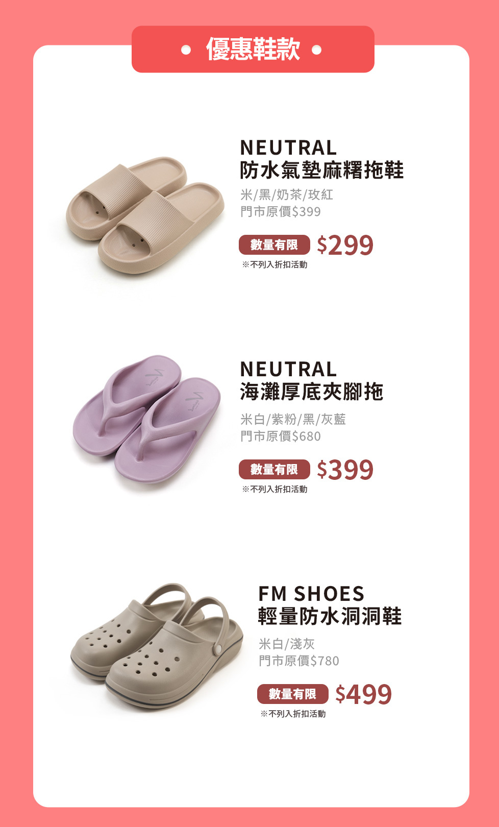 「NEUTRAL 防水氣墊麻糬拖鞋」,特惠價 1雙299元。「NEUTRAL 海灘厚底夾腳拖」,特惠價 1雙399元。「FM SHOES 輕量防水洞洞鞋」,特惠價 1雙499元。