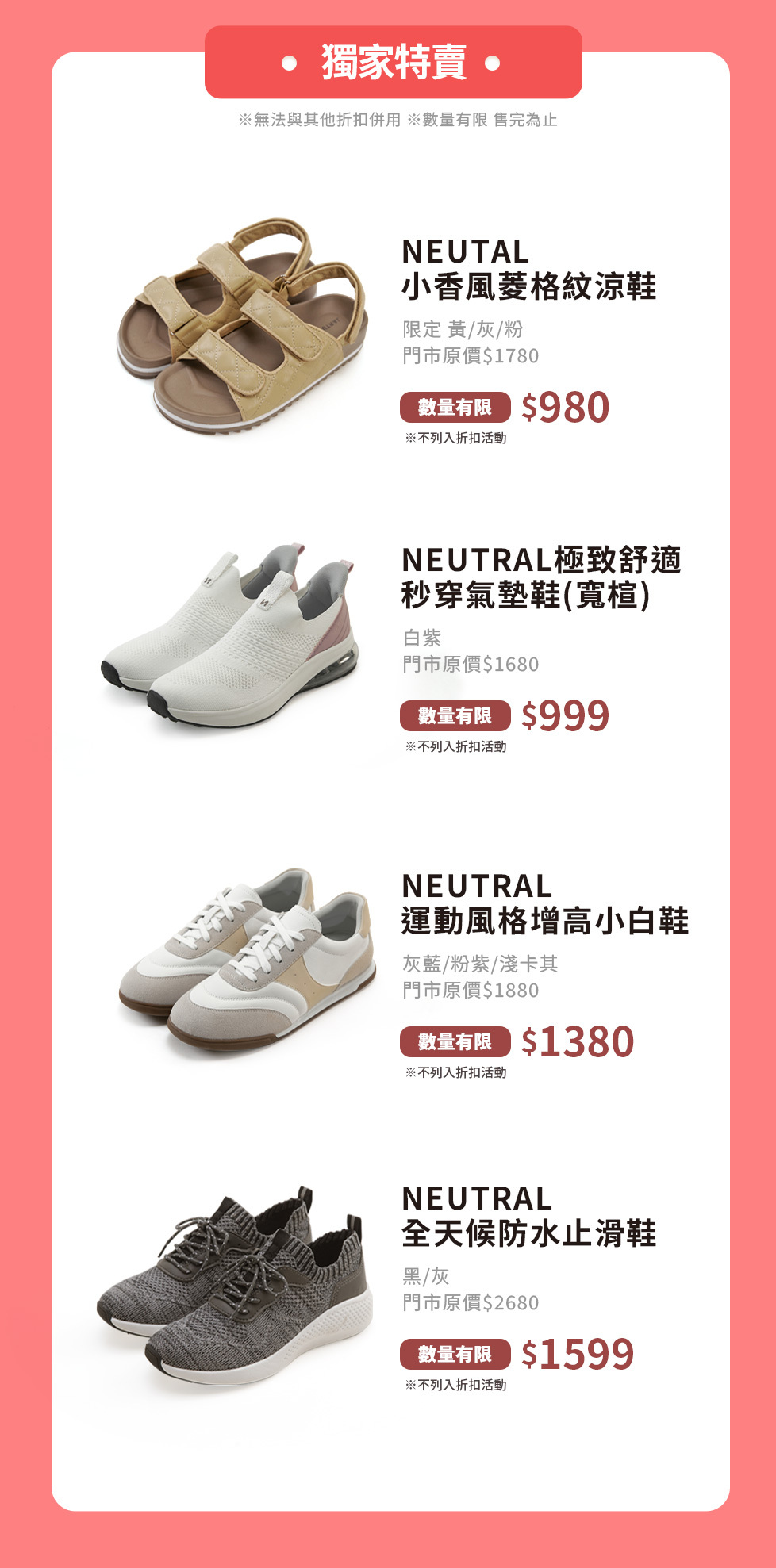 「NEUTRAL 小香風菱格紋涼鞋(限定 黃/灰/粉)」,優惠價 980 元。「NEUTRAL 極致舒適秒穿氣墊鞋(寬楦) (白紫)」,優惠價 999 元。「NEUTRAL 運動風格增高小白鞋(灰藍/粉紫/淺卡其)」,優惠價 1380 元。「NEUTRAL 全天候防水止滑鞋(黑/灰)」,優惠價 1599 元。